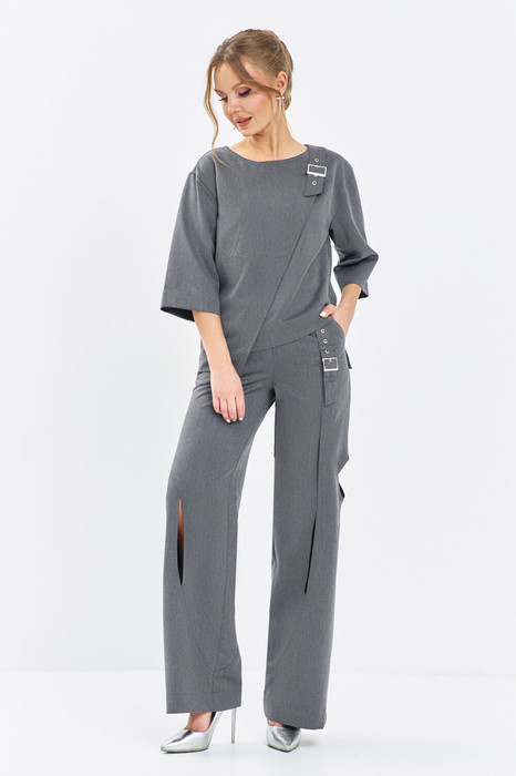 Костюм женский двухпредметный состоит из блузона и брюк. Блузон женский ассиметричного кроя, свободного прилегания. Блузон ассиметричного кроя, горловина округлая, по полочке расположена ассиметричная планка и декоративный хлястик с пряжкой. Рукав спущенный широкий укороченный с широкой манжетой по низу. Брюки асимметричного кроя, завышенной посадки, на притачном поясе с резинкой по переду брюк расположены функциональные карманы. !!! брюки разрезные по передней и задним частям брюк расположены декоративные прорези (обработанные).
