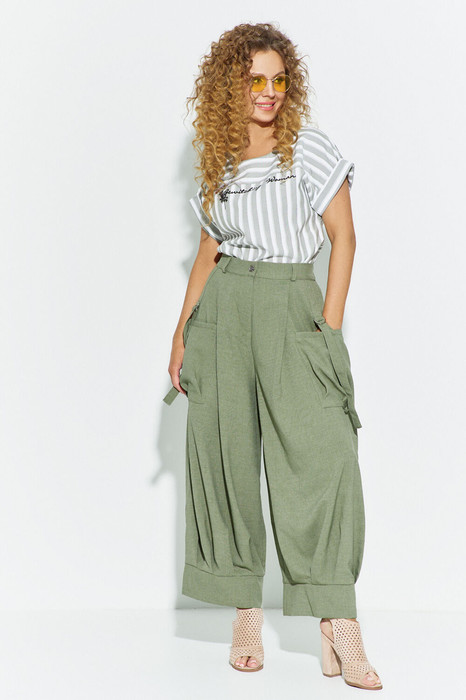 Комплект женский состоящий из блузона и брюк. Блузон прямого кроя с отрезной кокеткой по переду. Рукав приспущенный с манжетой по низу. Брюки высокой посадки с заложенными складками по линии талии и по низу. Изделие на широкой манжете по низу. По брючинам расположены накладные карманы.