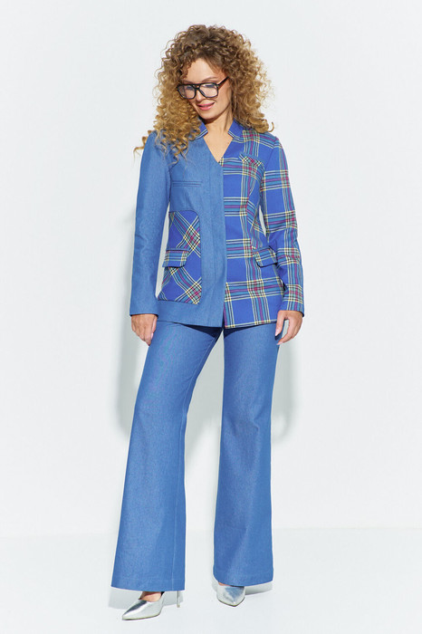 Костюм женский 2х-предметный, состоит из жакета и брюк. Жакет полуприлегающего силуэта выполнен из сочетания тканей Джинса и костюмной ткани, по полочке жакета расположена накладная деталь с функциональным прорезным карманом "рамка", и декоративные фальш-карманы в области груди. Рукав втачной длинный. Горловина обработана плоско лежащим воротником-стойкой. Застежка жакета - потайная (супатная) на петли-пуговицы. Жакет на полной подкладке. Брюки классического кроя, с небольшим клешем к низу,  с высокой посадкой, выполнены из джинсовой ткани. Пояс в брюках втачной  в боковых швах имеются карманы, застежка молния на гульфике и петля-пуговица. На задних полотнищах брюк расположена накладные карманы.