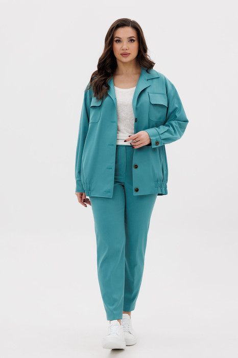 Свободный силуэт с заниженной линией плеча, рукав, расширенный в области оката, центральная застёжка на петли и пуговицы, стояче-отложной воротник.
