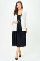 Платье упрямлённого силуэта, с отрезной кокеткой по полочке и спинке. Кокетка из эластичного кашкорсе. Кардиган свободного силуэта с заниженной линией плеча, рукавом расширенным в области оката. По низу рукава, кардигана и краю борта отделочное кашкорсе.