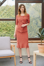Жакет из необычного по текстуре материала с вкраплением пайетки, брюки из полотна без пайетки. Полуприлегающий силуэт пиджака с центральной застёжкой, круглым вырезом горловины и втачным покроем. Полочка с фигурным рельефом, спинка с фигурным рельефом, центральным швом и плечевыми вытачками. Рукав двухшовный.