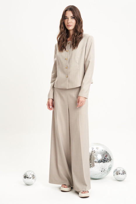 Длина жакета около 54 см. Длина рукава около 62 см. Фурнитура может отличаться от фото.  Брюки-палаццо широкие внизу и прилегающие вверху, с талиевыми вытачками по передним и задним половинкам. Застёжка по боковому шву.