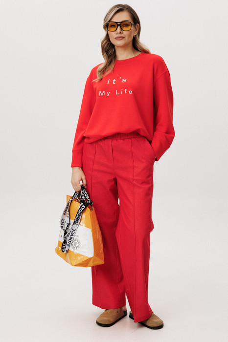 Брюки в расслабленном стиле, на эластичном поясе с наклонными боковыми карманами и кантом-защипом по передним половинкам брюк.