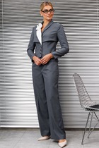 Джинсы на отрезном поясе со шлевками, с фигурными карманами по передним половинкам. Задние половинки брюк с отрезной кокеткой и накладными карманами. Боковая часть брюк с отделочными вытачками, придающими легкий объем в области голени. Длина брюк около 106см.