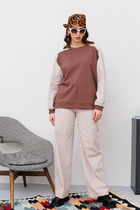 Свободный упрямлённый джемпер с заниженной линией плеча, V-образным вырезом и рукавом длиной 7/8. По горловине и низкам рукавов - отделочные полоски.