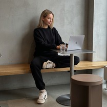 Костюм из гладкокрашеного трикотажного полотна «футер-двунитка», состоящий из джемпера и брюк. Джемпер - прямого силуэта, с длинными втачными рукавами, горловиной овальной формы, обработанной втачной планкой, притачным поясом и принтом на полочке, выполненным методом шелкографии. Манжеты рукавов, планка горловины и полупояса по низу изделия выполнены из эластичного полотна «рибана» в тон основному материалу, боковые швы смещены в сторону переда. Брюки – длинные слегка расширенные книзу, на притачном поясе с эластичной тесьмой внутри и карманами в боковых швах.