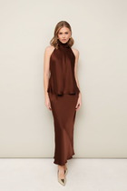 Юбка выполнена из текстильной ткани, зауженная к низу. Пояс притачной, по бокам резинка. По спинке шлица и застёжка на потайную молнию и пуговицу. Низ юбки обработан швом в подгибку с открытым срезом.