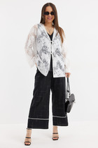 Брюки свободные, прямого силуэта. Пояс цельнокроеный на резинке, в боковых швах - карманы. Низ брюк обработан швом в подгибку с открытым срезом.