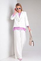 Костюм женский с юбкой и жакетом полуприлегающего силуэта на подкладке выполнен из костюмной ткани высокого качества в деловом стиле. Жакет со втачными рукавами, воротником пиджачного типа и прорезными карманами с клапанами по переду застегивается на петли и пуговицы, по низу рукавов функциональные потайные молнии. Юбка классическая "карандаш" с притачным поясом, в боковые швы которого вставлены резинки, застегивается на тесьму-молнию, петлю и пуговицу; сзади шлица.