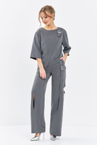 Женский костюм полуприлегающего силуэта на подкладке, состоящий из жакета и брюк. Изделие выполнено из костюмной ткани с содержанием вискозы. Жакет  имеет ассиметричную линию низа и функциональный накладной карман на правой полочке с декоративным кольцом. Воротник пиджачного типа, рукава втачные, застегивается на петли и пуговицы. Брюки полуприлегающего силуэта заужены к низу; пояс притачной с  резинкой в боковых швах  для лучшего прилегания, застежка на молнию петлю и пуговицу.