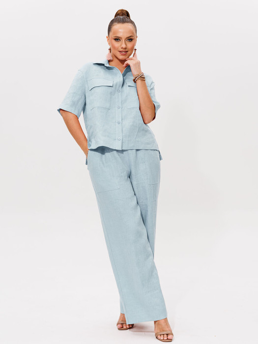 Льняной костюм двойка отличный выбор для женщин которые ценят комфорт и стиль.Этот  комплект состоит из рубашки и брюк, идеально подходит для жарких дней. Рубашка прямого силуэта с воротником стойкой и застёжкой на петли и пуговицы. По переду имеются накладные карманы.
