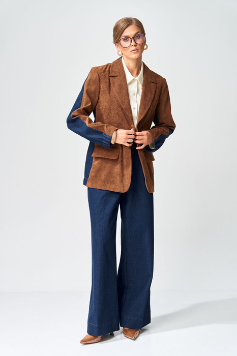 Костюм состоит из жакета и брюк. Жакет прямого силуэта сзади с имитацией куртки выполнен из вельветовой и хлопковой джинсовой ткани. Застежка  однобортная на 2 петли и  пуговицы. Воротник пиджачного типа.   Перед с талиевой вытачкой, рельефом и декоративным клапаном. Спинка с кокеткой и складкой.  Рукав втачной двухшовный. Низ спинки и нижней части рукава собраны на резинку. Брюки расширеные книзу на притачном поясе. По поясу настрочены шлевки. По передним и задним частям брюк вытачки. На задних частях брюк настрочены карманы. Карманы, вытачки, пояс, низ брюк отделаны отделочной строчкой. Длина жакета - 70 см, длина рукава  - 60 см. Длина брюк с учетом пояса -109 см. Данная модель прекрасно сочетается с другой моделью из нашей коллекции 15409. Создайте гармоничный образ, комбинируя эти изделия!