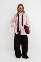 Костюм состоит из жилета и брюк, выполеных из костюмной ткани. Жилет полуприлегающего силуэта с воротником пиджачного типа. Перед с рельефами, талиевой вытачкой и декоративным клапаном. Застежка центральная однобортная на 2 петли и пуговицы. Спинка со средним швом и рельефами. Вдоль оката рукава выполнена декоративная планка. К жилету прилагается тонкий пояс из основной ткани. Брюки расширеные книзу с притачным поясом. Спереди застежка гульфик на молнии и с петлей и пуговицей по поясу. По задней частям брюк вытачки. В боковых швах карманы с наклонным входом. По поясу широкие шлевки. Брюки со срелками застроченными по переду и заутюженными сзади. Длина жилета - 71 см, длина брюк с учетом пояса - 109 см.