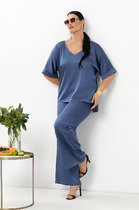 Костюм состоит из блузки и брюк. Блузка свободного силуэта из струящейся шифоновой ткани. Перед и спинка с кокеткой и сборкой. Рукав спущенный свободный с резинкой понизу. Вдоль линии кокетки и рукава вставлена рюша. Горловина V-образной формы с воротником стойкой переходящей в бант.  Брюки палаццо с притачным поясом из мягкой вельветовой ткани. Спереди застежка гульфик на молнии и петлей и пуговицей по поясу. По задней частям брюк вытачки. Пояс с резинкой в боковых частях. Брюки с заутюженными стрелками. Длина блузки - 67см, длина рукава - 60 см. Длина брюк с учетом пояса - 109 см.