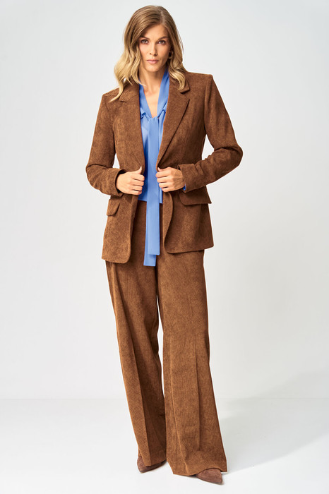 Костюм состоит  из жакета и брюк. Жакет полуприлегающего силуэта из мягкой вельветовыой  ткани приятного каштанового цвета.  Застежка однобортная на две пуговицы, воротник пиджачного типа.  Перед с талиевой вытачкой, рельефом и декоративным клапаном. Спинка с рельефами из проймы и средним швом.  Рукав втачной двухшовный. Жакет на подкладке. Брюки палаццо с притачным поясом из мягкой вельветовой ткани. Спереди застежка гульфик на молнии и петлей и пуговицей по поясу. По задней частям брюк вытачки. Пояс с резинкой в боковых частях. Брюки с заутюженными стрелками. Длина жакета - 68 см, длина рукава жакета - 60 см. Длина брюк с учетом пояса - 109 см. Данная модель прекрасно сочетается с другой моделью из нашей коллекции 15410. Создайте гармоничный образ, комбинируя эти изделия!