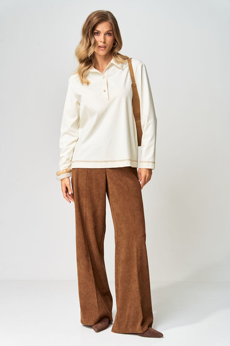 Джемпер прямого силуэта с воротником поло из плотной хлопковой ткани "двухнитка". Рукав втачной одношовный. По низу изделия, по низу рукава и по воротнику проложена отделочная строчка. Брюки палаццо с притачным поясом из мягкой вельветовой ткани. Спереди застежка гульфик на молнии и петлей и пуговицей по поясу. По задней частям брюк вытачки. Пояс с резинкой в боковых частях. Брюки с заутюженными стрелками. Длина джемпера- 66 см, длина рукава - 60 см. Длина брюк с учетом пояса - 109 см.