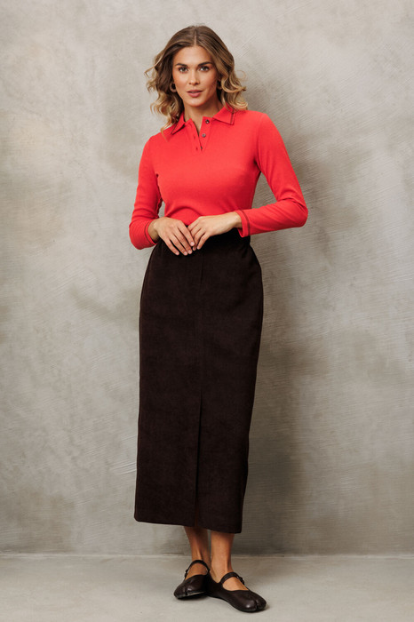 Костюм состоит из джемпера и юбки. Джемпер приталеного силуэта с воротником поло из трикотажного полотна. Рукав втачной одношовный. Длина джемпера - 57 см, длина рукава - 60 см. Юбка прямого силуэта выполненная из мягкой вельветовой ткани. Передняя честь юбки с вытачками, со средним швом и застежкой гульфиком на молнии и щлицей спереди. Задняя часть юбки с вытачками. Юбка на притачном поясе с затежкой на петлю и пуговицу спереди и резинками по бокам. Юбка на подкладке. Длина юбки с учетом пояса - 90 см.