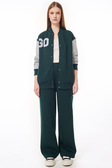 Современный женский костюм, состоящий из бомбера и брюк. Бомбер свободного силуэта, выполнен из ткани-футера двух цветов с застежкой на металлические кнопки. На переде функциональные прорезные карманы и дизайнерская нашивка в виде букв “GO” на правом переде. Низ изделия, горловина, манжеты рукавов выполнены из ткани-компаньона кошкорсе. Брюки прямого силуэта с притачным поясом, резинкой внутри. Передняя половинка брюк с удобными боковыми карманами.