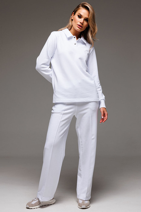 Для очаровательного образа не хватает воротничка! Воротник и застежка поло - маленькая деталь, которая «смягчает» и делает нежным весь аутфит. Брюки со стрелками добавят образу строгости и деловитости, что позволит носить костюм как на прогулки, так и в офис. Пошит из комфортной ткани - футера 3-нитки без начеса.