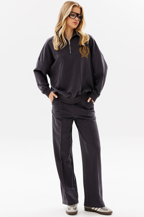 Женский яркий, повседневный костюм, состоящий из оверсайз свитшота с контрастной вышивкой и брюк со стрелками. Это находка для тех, кто ценит свободу, стиль и не хочет отказывать себе в комфорте 24/7.
