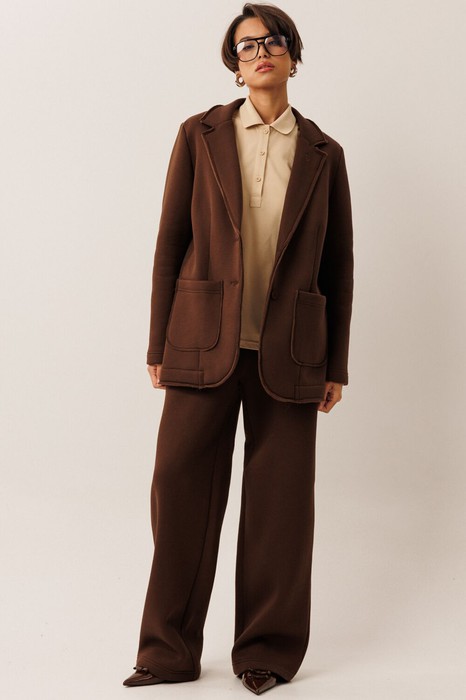 Жакет прямого силуэта с пиджачным воротником, имеет удобные накладные карманы и застежку на 2 пуговицы. На левом лацкане вышивка-логотип в цвет ткани. Низ и борта имеют открытые края (эффект необработанного шва), укреплены дополнительной строчкой. Жакет без подкладки.