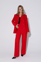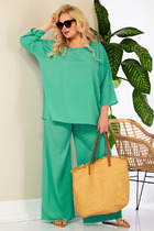 Жакет с центральной застежкой на петли и пуговицы, втачным воротником и отложными лацканами пиджачного типа. По боковым швам со шлевками для съемного пояса. Брюки с отрезным поясом, на поясе расположены шлевки. Передние половинки с карманами, двумя односторонними складками, вход в карман наклонный к боковому шву. Застежка гульфик.