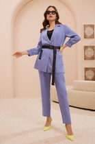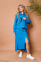 Блузон с втачным воротником с отрезной стойкой, центральной застежкой на кнопки. Полочки с отрезными планками, нагрудными вытачками и отрезным поясом. Спинка цельная. Рукав втачной, длинный, с отрезной манжетой. Юбка с отрезным поясом, пояс в области спинки присборен на резинку. В боковых швах расположены карманы. Переднее полотнище с рельефом, заканчивающимся шлицей. Юбка без подкладки.