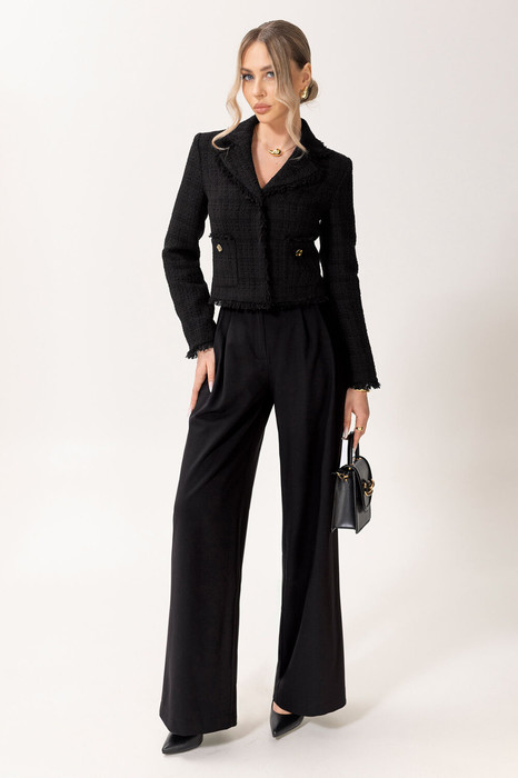 Жакет с центральной застежкой на пришивные кнопки, с втачным воротником и отложными лацканами пиджачного типа. По переду с рельефами, выходящими из проймы. На уровне линии талии расположены накладные карманы застегивающиеся на одну петлю и пуговицу. Спинка со средним швом, рельефами, выходящими из проймы. Рукав втачной, длинный. По краю борта, воротника, низу жакета и низу рукава- бахрома из основной ткани. Брюки прямые, с отрезным поясом, на поясе расположены шлевки. По спинке пояс присборен на резинку. По боковым швам расположены карманы. Вход в карман наклонный к боковому шву. Передние половинки брюк с двумя односторонними складками. Застежка гульфик.
