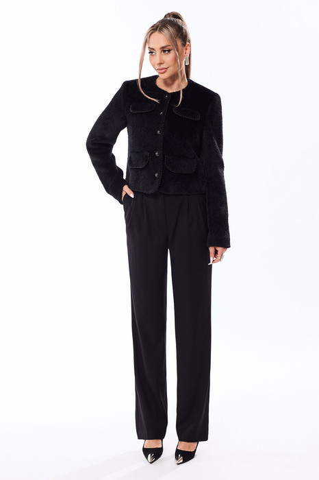 Жакет прямого силуэта с центральной застежкой на петли и пуговицы, без воротника, с круглым вырезом горловины. По переду с нагрудными вытачками. На уровне груди и линии талии расположены настрочные клапаны . Спинка со средним швом. Рукав втачной, длинный. Брюки прямые, с отрезным поясом и шлевками. В области спинки пояс присборен на резинку. На передних половинках расположены две односторонние складки и карманы. Вход в карман наклонный к боковому шву. Застежка гульфик.