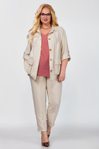 Блузон с центральной застежкой на петли и пуговицы, втачным воротником с отрезной стойкой. По переду с нагрудными вытачками, спинка цельная, по боковым швам- разрезы. Рукав втачной, длинный, с отрезной манжетой. Топ без воротника, с V-образным вырезом горловины. По переду с нагрудными вытачками. Брюки прямые, с отрезным поясом. Пояс присборен на резинку. Передние половинки с карманами. Вход в карман наклонный к боковому шву.
