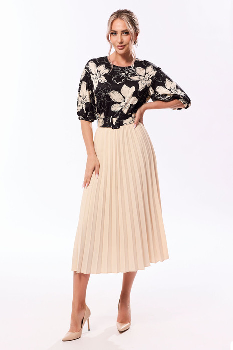 Блузка, без воротника, с круглым вырезом горловины, застежкой на потайную молнию в среднем шве спинки. По переду с нагрудными вытачками. По спинке со средним швом. Рукава с отрезной манжетой, присборенной на резинку. Плечо спущенное. Юбка, с отрезным поясом, застежкой на потайную молнию в левом боковом шве. Юбка плиссированная со складками гофре. Комплект со съемным поясом.
