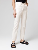 Блузон с высоким отрезным воротником- хомут. По переду с отрезной V- образной кокеткой. Спинка цельная. По низу блузона- кулиса со шнуром. Рукав втачной, длинный Плечо- спущенное. Брюки прямые, с отрезным поясом. Пояс присборен на резинку. В боковых швах расположены карманы.