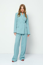 Жилет с центральной застежкой на петли и пуговицы, без вортника, с круглым вырезом горловины. По переду с рельефами, выходящими из проймы до низа, на уровне линии бедер расположены прорезные карманы с листочками и клапанами. По спинке со средним швом и рельефами, выходящими из проймы до низа. Юбка без пояса, верхний срез обработан обтачками. Заднее полотнище со средним швом, застежкой на потайную молнию в среднем шве.