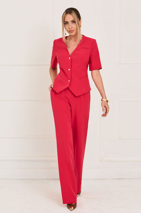 Жакет с центральной застежкой на петли и пуговицы, без воротника, с V-образным вырезом горловины. По переду с талиевыми вытачками и рельефами, выходящими из проймы, прорезными карманами в рамку, расположенными на уровне линии талии. Спинка со средним швом, рельефами, выходящими из проймы. Рукав втачной, короткий. Брюки с отрезным поясом, на поясе по переду расположены декоративные пояски с пряжками. Пояс в области спинки присборен на резинку. Застежка гульфик. По боковым швам расположены карманы. Вход в карман наклонный к боковому шву.