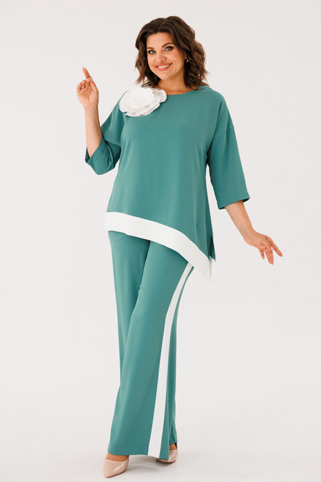 Блуза свободного силуэта, вырез горловины округлый, рукав со  спущенной проймой, длинной 3/4. Низ  изделия ассиметричный с отделкой другого оттенка. Блуза без застежки.