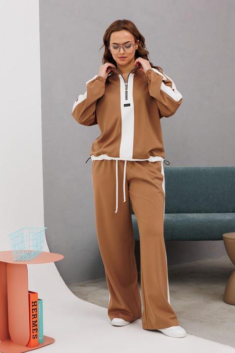 Джемпер свободного силуэта, вырез горловины со стойкой и застежкой на тесьму-молнию. Рукав спущенный, длинный. Декором являются лампасы из отделочной ткани. По лицу изделия кулиса из резинки.