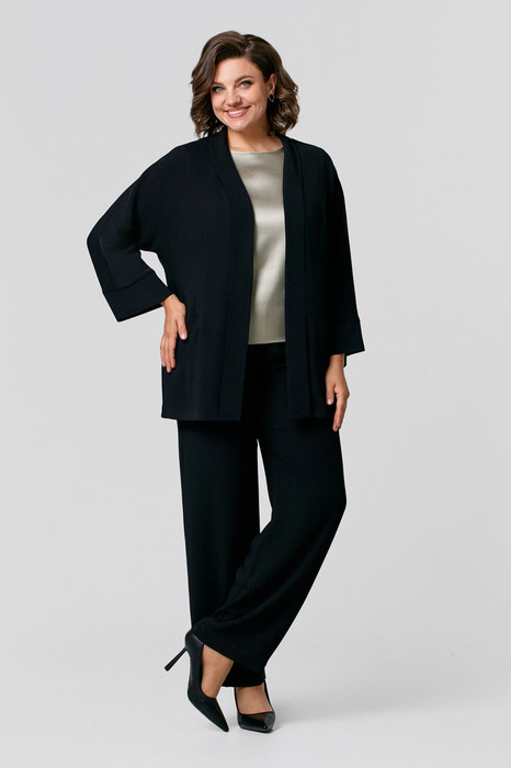 Женский костюм, состоящий из жакета, брюк и топа, выполнен из мягкой струящейся ткани. Удлиненный жакет без подкладки с функциональными карманами по переду и рукавами "летучая мышь". Брюки прямого силуэта с притачным поясом на резинке по бокам, в боковых швах карманы с отрезным бочком, застежка на молнию, петлю и пуговицу. Базовый топ выполнен из мягкой струящейся ткани, рукава со спущенной линией плеча.