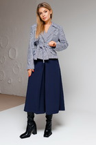 Костюм женский полуприлегающего силуэта с брюками и джемпером выполнен из трикотажного полотна средней плотности.  В джемпере V-образная горловина и втачные рукава дополнены декоративными вставками молочного цвета. Брюки прямые с завышенной линией талии и притачным поясом на резинке, в боковых швах карманы. Изделие прошло тестовую стирку при температуре 30 градусов и химическую чистку: не меняет цвет и не линяет.