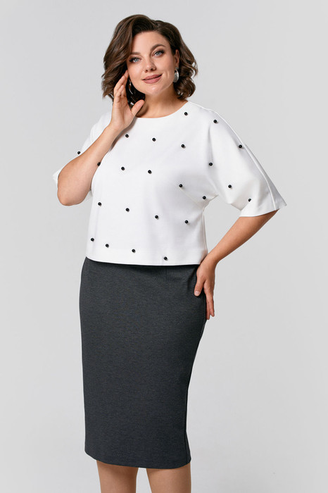 Костюм женский, состоящий из джемпера и юбки. Джемпер полуприлегающего силуэта, из трикотажного полотна средней плотности, рукава цельнокроеные; застежка на молнию по спинке, по переду декоративные бусины - жемчуг. Юбка полуприлегающего силуэта на подкладке с антистатическим эффектом; с завышенной линией талии, на поясе- обтачке, по спинке застежка на молнию, внизу шлица.