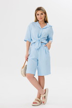 Костюм женский полуприлегающего силуэта выполнен из облегченной костюмной ткани с небольшим содержанием стрейча и состоит из жакета и юбки. Жакет без подкладки со втачными рукавами, рубашечным воротником, застежкой-планкой на петли и пуговицы. По воротнику, низу рукавов и жакета вставлена оборка из той же ткани белого цвета. Юбка полуприлегающего силуэта на хлопковой подкладке заужена к низу, пояс притачной с резинками в боковых швах и застежкой на тесьму-молнию и пуговицу. Костюм прошел тестовую стирку при температуре 30 градусов ( не линяет). Изделие соответствует размеру.