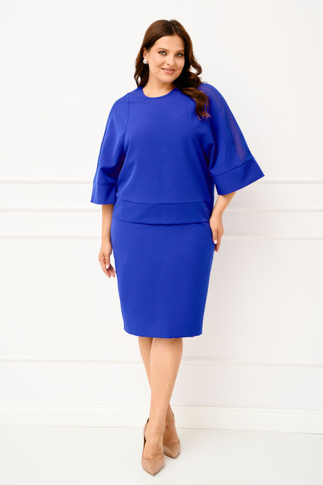 Костюм женский полуприлегающего силуэта, состоящий из блузы и юбки, выполнен из костюмной ткани. Рукава цельнокроенные с фигурными подрезами и вставкой из шифона, создающей лёгкий полупрозрачный эффект, в тон основной ткани; по спинке застежка-молния. Юбка полуприлегающего силуэта на  подкладке с притачным поясом, в боковые швы которого вставлена резинка для лучшего прилегания; по спинке шлица; застежка на молнию, петлю и пуговицу. Костюм полностью соответсвует заявленному размеру. Пользуйтесь таблицей замеров готового изделия.