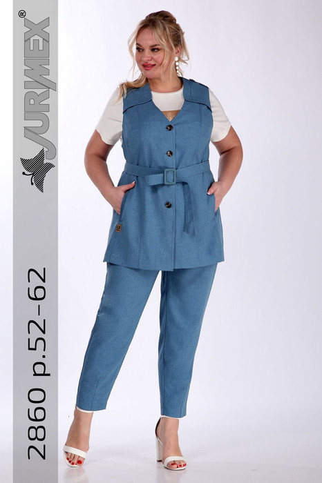 Комплект брючный 3-х предметный состоит из жилета, брюк и джемпера. Жилет из костюмно-плательной ткани прямого силуэта. Горловина V-образной формы, застежка центрально-бортовая на петли и пуговицы. В рельефах переда обработаны карманы. По переду фигурные отлетные кокетки. Спинка разрезная, с кокеткой. По боковым швам разрезы, по плечевым паты. Брюки средней посадки, заужены к низу за счет вытачек. По переду обработаны боковые карманы с подрезным бочком, по задним деталям фигурные накладные. Пояс в 58-62 размерах частично на резинке. Джемпер свободного силуэта, рукав цельнокроенный, дополнен печатью.