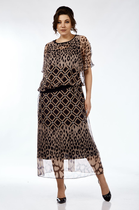 Комплект женский, состоит из платья и блузы. Платье А-силуэта, комбинированное, верх из трикотажного полотна, низ из шифона. Блуза свободного кроя по низу притачная планка из трикотажного полотна. Горловина круглой формы, окантована. Рукав цельнокроеный.