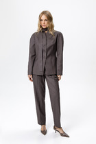 Комплект брючный, состоит из туники и брюк. Туника свободного силуэта из вискозной ткани. Горловина оформлена воротником, спереди фигурный вырез. Рукава цельнокроеные. В боковых швах внизу обработаны высокие разрезы со стяжкой. Брюки средней посадки, прямые. В передних деталях брюк расположены карманы. Пояс на резинке.
