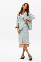 Комплект женский брючный. Джемпер свободного кроя, изготовлен из трикотажного полотна. Перед разрезной с фигурным низом. Горловина обработана воротником -хомут. Спинка цельнокроеная. Декором служит вышивка — аппликация. Брюки женские, средней посадки выполнены из экокожи. Обработаны боковые карманы. Пояс на резинке. На передних деталях брюк застрочен кант