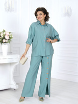 Костюм брючный двухпредметный, выполнен из костюмно-плательной ткани с эффектом легкой мятости. Состоит из блузки и брюк. Блузка свободного силуэта. Воротник стояче-отложной с  лацканами переходящими в планку. На спинке кокетка, со встречной складкой. Рукава спущенные. Изделие дополнено съемным декором. Брюки средней посадки, свободного кроя. Пояс притачной на эластичной тесьме. В передних деталях обработаны карманы с подрезным бочком.