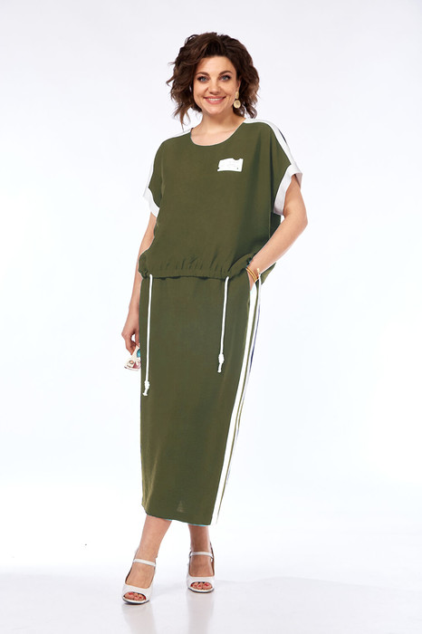 Костюм женский двухпредметный состоит из блузки и юбки, выполнен из вискозной ткани с эффектом мятости. Блузка свободного силуэта. Горловина округлой формы. Перед и спинка цельнокроеные. По плечевым обработаны вставки из отделочной ткани. Рукава короткие цельнокроеные, по низу притачная манжета из отделочной ткани. Низ блузки обработан кулисой с декоративным шнуром. Юбка прямого силуэта, пояс притачной на эластичной тесьме. По передним деталям юбки обработаны карманы с подрезным бочком. По задним деталям юбки имеется средний шов со шлицей.  В боковых швах вставки из отделочной ткани. Юбка на подкладке.