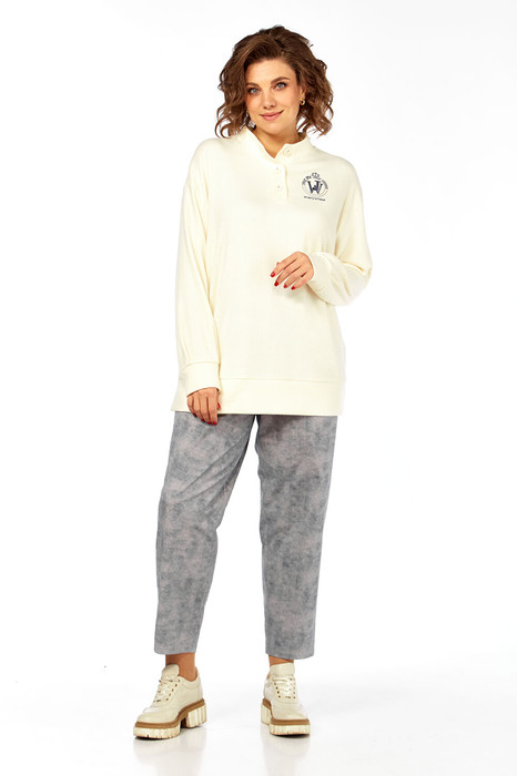 Комплект брючный, состоит из джемпера и брюк. Джемпер свободного кроя, изготовлен из трикотажного полотна. Горловина обработана воротником-стойкой и притачными планками с застежкой на петли и пуговицы. На полочке расположена вышивка. Рукава спущенные, по низу обработаны манжеты. По низу изделия притачная деталь с разрезами по бокам. Брюки изготовлены из хлопковой костюмной ткани под джинс В брюках обработан пояс, застежка на тесьму-молнию и петлю пуговицу. На задней части брюк кокетка и накладные карманы. На передней части боковые карманы.