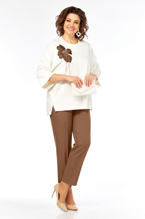Комплект брючный 2-х предметный состоит из джемпера и брюк. Джемпер свободного силуэта, выполнен из трикотажного полотна. Горловина округлой формы обработана бейкой. Перед и спинка разрезные по центру и обработаны декоративным швом. Рукава спущенные. В боковых швах обработаны фигурные шлицы. Джемпер декорирован дизайнерской вышивкой — аппликацией. Брюки классической посадки с притачным поясом со вставками эластичной тесьмы. Застежка на петлю и пуговицу. В передних деталях брюк имеются карманы с подрезным бочком.